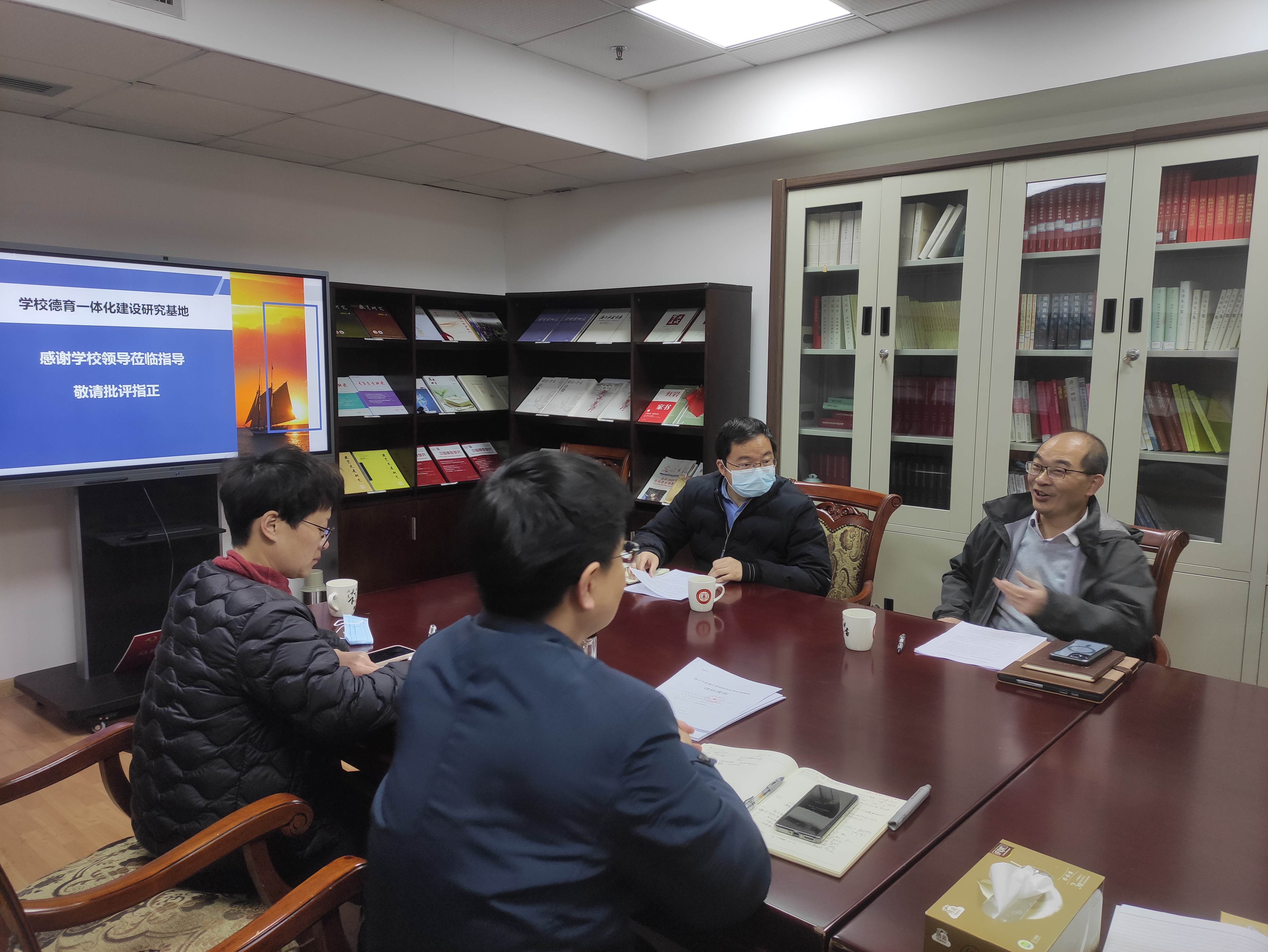杨灿军副校长听取汇报后,肯定了基地的研究选题很好,建设一年来取得了一定的成果,就基地建设提出了三点要求,一是从系统性、阶段性、需求性的角度加强学校德育一体化融合研究;二是结合基地发展目标,加强咨政能力建设,从大处着眼,从小处着手,结合基层实际,注重总结工作成效;三是加强跨学科的合作,加强和数据、设计、传媒等相关学科的交叉研究和应用实践,整合优势资源,突出基地特色。
