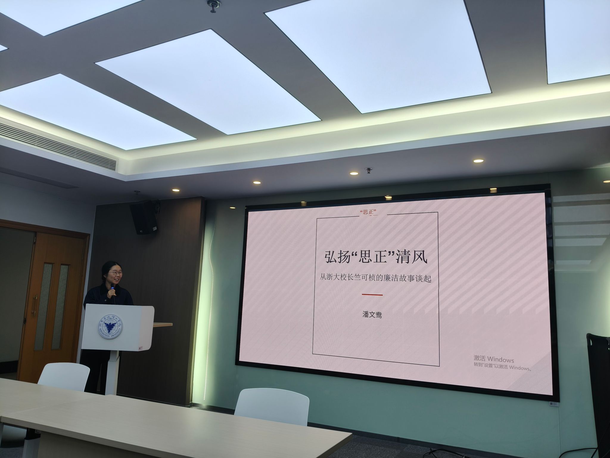 教工一支部的陈伟、宫婉琳两位老师分别围绕党的作风建设和廉洁文化建设开展了题为《作风建设百年路:从“一根灯芯”到“八项规定”的初心传承》《甬江廉韵 “理”响清风》的党课宣讲,系统回顾了党在不同历史阶段始终坚守的清廉本色与纪律要求;教工二支部的陈辉和潘文鸯两位老师分别围绕党史中的廉洁故事和浙江大学竺可桢老校长的廉洁故事开展了题为《党史中的廉洁故事及启示》《弘扬“思正”清风:从竺可桢校长廉洁故事谈起》的党课宣讲,他们结合党史中的廉洁故事及高校实际,探讨了思政教师队伍如何夯实廉洁思想根基、将清廉理念有机融入教育教学全过程。