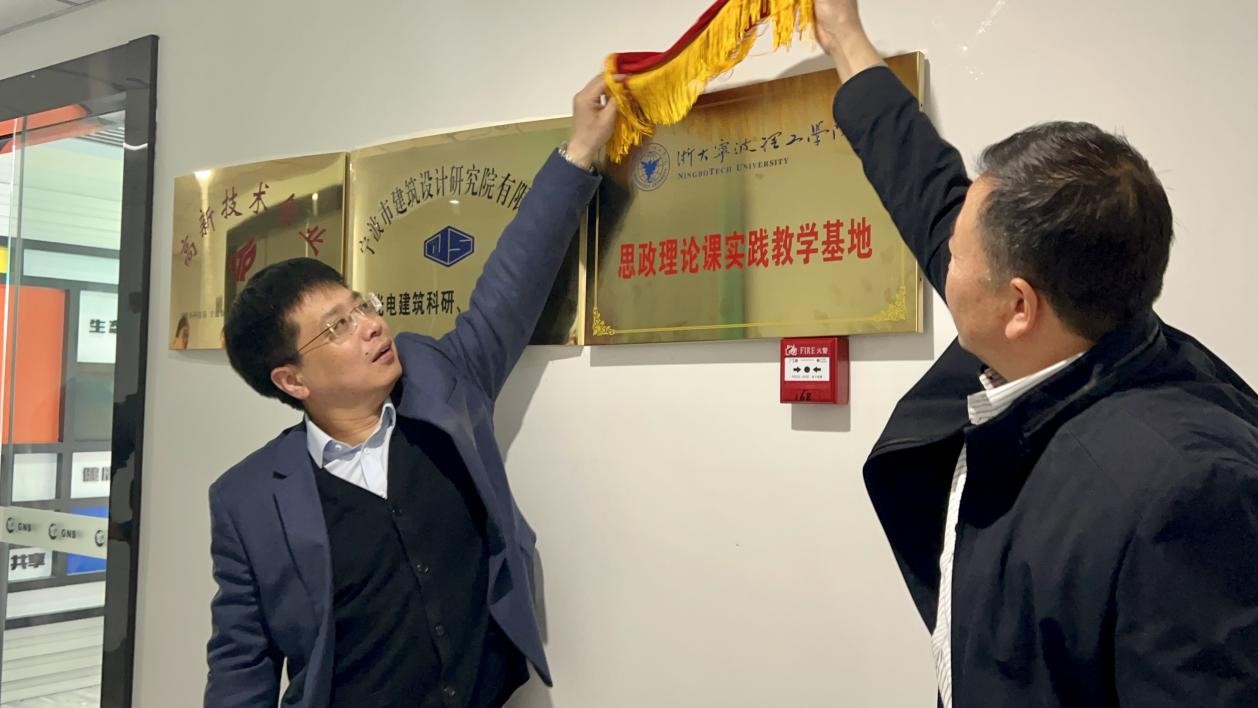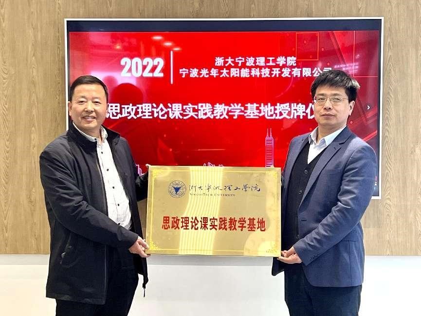 3月31日上午,马克思主义学院与宁波光年太阳能科技开发有限公司共建“思想政治理论课实践教学基地”挂牌仪式在光年能源城市展厅举行。马克思主义学院院长费英勤、党总支书记、副院长伍醒和宁波光年太阳能科技开发有限公司董事长周松成为实践教学基地挂牌,宁波光年太阳能科技开发有限公司总经理薛井平、首席运营官王华军、副总经理姜春香,马克思主义学院党总支副书记张维雅、教师张硕出席挂牌仪式。