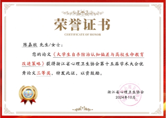 本次年会共收到论文122篇,经过专家评审,共评出25篇获奖论文,其中一等奖2篇,二等奖5篇,三等奖18篇。由我院教师陈嘉欣撰写的《大学生自杀防治认知偏差与高校生命教育改进策略》获得三等奖。文章揭示大学生难以将自杀看作是一种复杂的道德现象、对沟通和评估过程存在顾虑、危机干预中问题导向意识不够等主要的认知偏差,并提出相应的生命教育优化途径。这一研究成果是马院在心理健康教育领域取得的一项重要成果,有助于更好地服务于全校学生的健康成长。