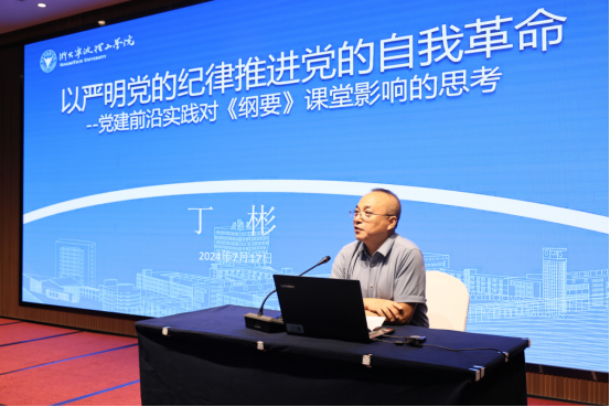 浙大宁波理工学院中共党史党建研究中心主任丁彬教授围绕“以严明党的纪律推进党的自我革命——党建前沿实践对《纲要》课堂影响的思考”作了主题发言。他首先从一百多年党史经验的规律等角度全面阐述了勇于自我革命是我党区别于其他政党显著标志的观点,强调严明纪律是我党自我革命的重要抓手,重点讲解了《中国共产党纪律处分条例》修订的重大意义、重点内容、重要指引等内容。丁彬教授的发言把党建实践和“纲要”课教学联系起来,拓展了课程建设的思路和内容,带动了参会教师积极思考和交流探讨。