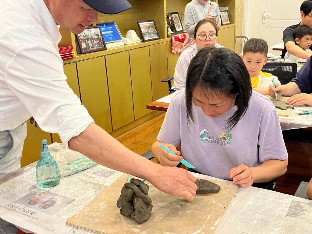 在数字文化(元宇宙)创新实验室,同学们观摩了各种类型的数字化、信息化设备,了解了如何利用设备制作出虚拟现实的场景及数字人,并戴上设备沉浸式体验了气势恢宏的河姆渡文化视觉盛宴。参观结束后,孩子们以家庭为单位,在泥塑塑师的指导下,学习制作了各类泥塑物品,不仅锻炼了动手能力,更是深入了解了中国传统文化中泥塑人物的典故。