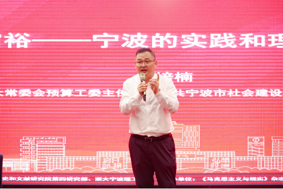 宁波市人大常委会预算工委主任、原中共宁波市社会建设委员会专职副主任竺培楠作题为《共同富裕——宁波的实践和理论的探索》的主题报告。他讲述宁波推进共同富裕的探索与实践经验。宁波市通过详细规划采用“1+7+n”模式,以经济发展为中心,逐步缩小城乡差距、地区差距和收入差距,包括浙大宁波理工学院在内的高校和研究机构为共同富裕提供了重要的技术支撑和咨政建议。