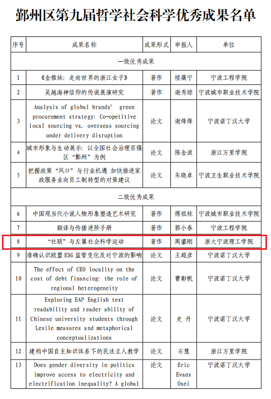 近日,鄞州区第九届哲学社会科学优秀成果正式公布。我院周鎏刚老师的著作《“社联”与左翼社会科学运动》荣获宁波市鄞州区第九届哲学社会科学优秀成果二级成果奖。