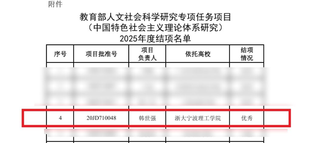 近日,教育部人文社会科学研究专项任务项目(中国特色社会主义理论体系研究)2025年度结项结果公示,我院韩世强老师主持的《全面依法治国背景下推进弱有所扶研究》被评定为优秀。据悉,该批次全国仅有四项课题获此殊荣。这一荣誉的取得,不仅是对项目研究的高度认可,也将为学院今后继续申报此类课题奠定良好基础。